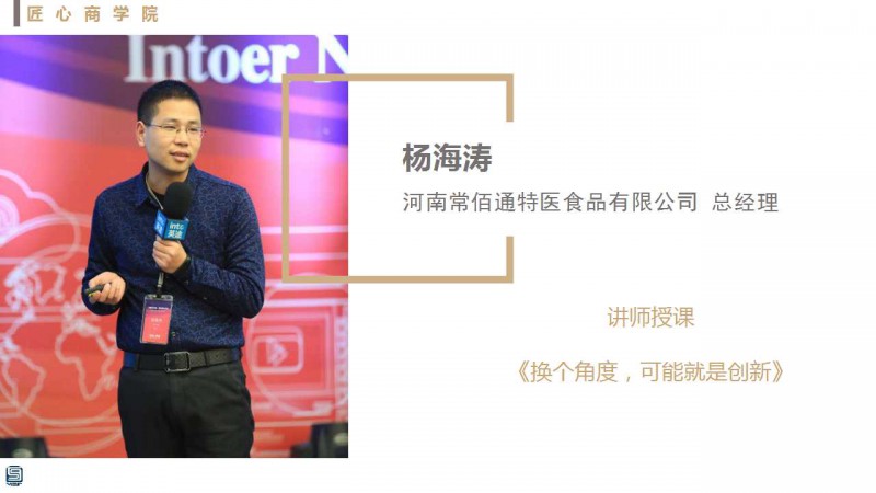 三、15:50-16:00 課間休息 《換個角度,可能就是創(chuàng)新(二)》——河南常佰通特醫(yī)食品有限公司 總經(jīng)理 楊海濤先生