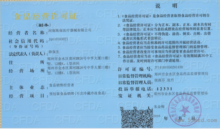 | 發(fā)證機(jī)構(gòu): | ??鄭州市金水區(qū)食品藥品監(jiān)督管理局 | 發(fā)證時間 : | ??2018-11-02 |